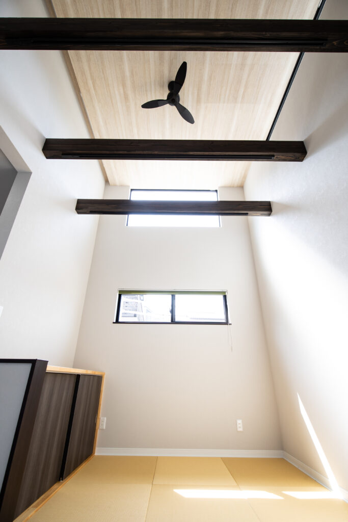 立地的に北側向きが正面に向いた配置のお家になるので、LDKに一部吹き抜けとし高い位置サッシを設けて光が入ってくるように施工されました。